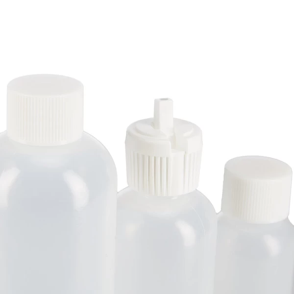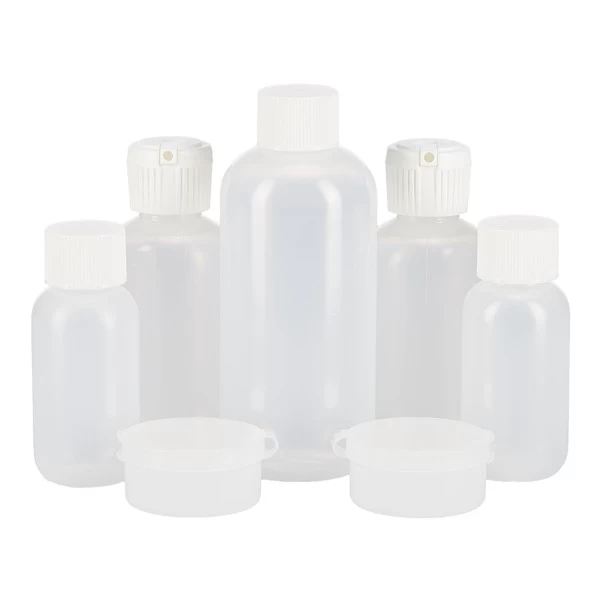 Universelles Set aus verschieden großen Kunststoffflaschen und Dosen für Lebensmittel, Medizin, Kontaktlinsenflüssigkeit etc. Die Behälter sind Handgepäckgeeignet.