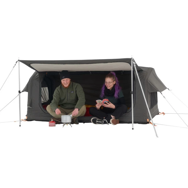 Die fest aufgepumpten Schläuche können mit bis zu 0,8 bar Druck aufgepumpt werden. Sie spannen das Material aus Baumwoll-Mischgewebe stramm ab. Ein breiter seitlicher Einstieg erleichtert den Zugang zum Zelt und ist mit einem Moskitonetz ausgestattet. Der Eingang kann bei Bedarf mit zwei Tarpstangen zu einem Vordach aufgespannt werden.