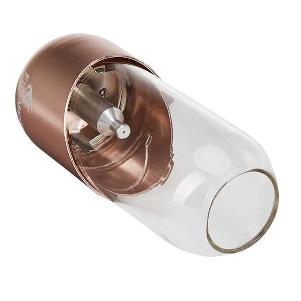 Die Lampe wird durch ein Loch im Glas entzündet, das auf Flammenhöhe angebracht ist. Um das Licht vor Wind zu schützen, wird die Metallseite zum Wind gedreht.