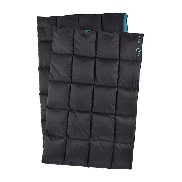 Ultraleichte Daunendecke mit kleinstem Packmaß. Die Decke ist so groß, dass man sich so richtig einwickeln kann, wenn es zugig wird – funktioniert auch zu Hause.