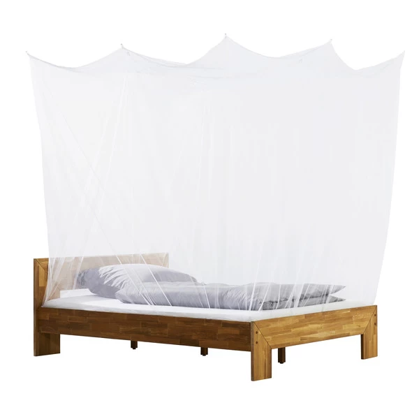 Preiswertes, kastenförmiges Moskitonetz mit luftiger Maschenweite für Doppelbetten. Ideal für heimische Gefilde. Acht Aufhängepunkte an der Deckenfläche spannen das Netz ab und lassen es gut fallen.