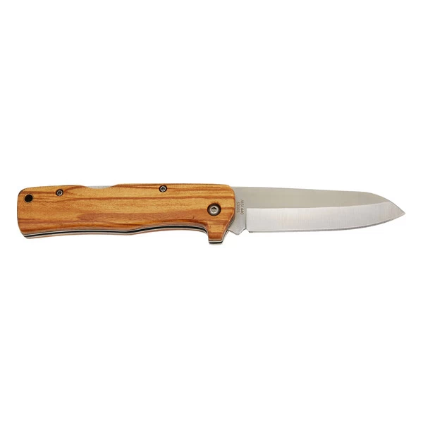 Handliches Taschenmesser mit verschraubten Olivenholzgriffschalen und einer 9 cm langen Klinge aus AISI 440 Stahl. Durch die Nagelhauöffnung eignet es sich prima als EDC-Messer.