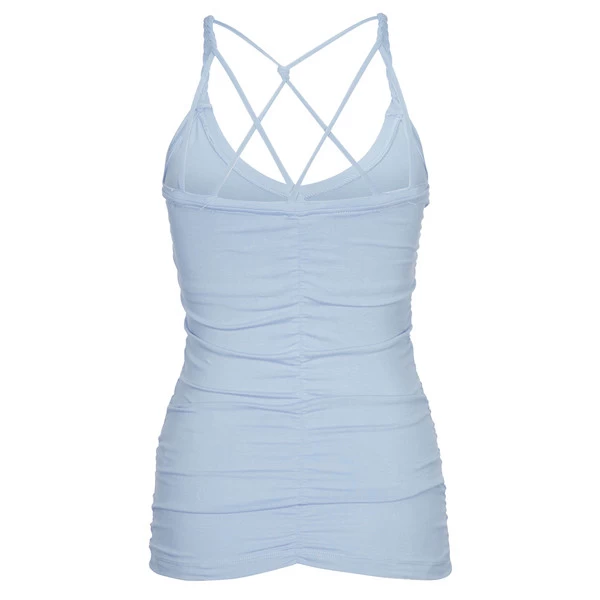 Die Bio-Baumwolle verleiht dem Top seine äußerst angenehme Haptik, während der Elasthan-Anteil in komfortabler Dehnbarkeit mündet. Die geflochtenen Träger laufen hinten in ein überkreuztes Muster zusammen, was einen festen Sitz verspricht. Schultern und Rücken werden hierdurch zum absoluten Blickfang. Der tiefe Ausschnitt und die geraffte Naht, die sich über die Mitte der Vorder- und Rückseite erstreckt, sind ein weiteres Highlight des Tops.