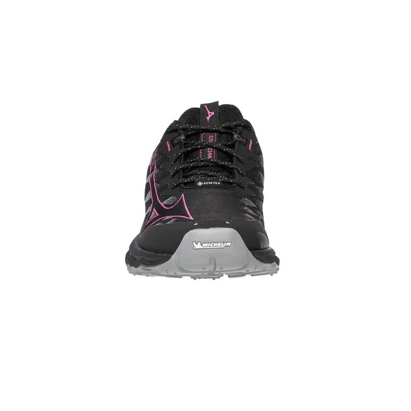 Ansonsten kommt als Obermaterial synthetisches Mesh-Gewebe zum Einsatz. Dieses ist besonders unempfindlich gegenüber Nässe und Schmutz und lässt sich einfach reinigen. Gleichzeitig ist es äußerst atmungsaktiv, sorgt also auch bei intensiven Einheiten für einen optimalen Feuchtigkeitstransport aus dem Inneren des Schuhs heraus an die Umgebungsluft. Dieser Umstand wird auch durch die wasserdichte Gore-Tex Membran weiter unterstützt. Diese hält aber auch Nässe davon ab von außen ins Innere des Schuhs einzudringen.