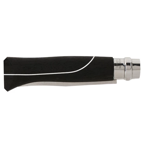 Das klassische Opinel-Messer No.08 in gehobener Variante. Die Klinge aus Inox-Stahl wird durch den Griff aus mattem Ebenholz ergänzt, den ein eingearbeiteter Alumiuniumstreifen ziert.