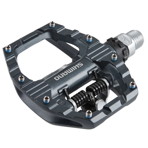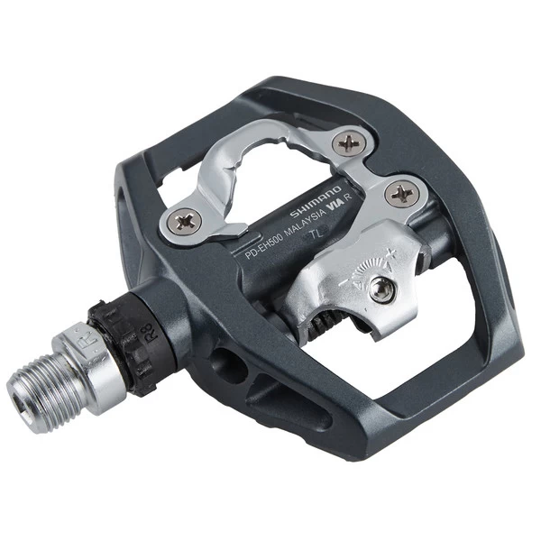 Für sportlichere Fahrweisen steht das Klick-System zur Verfügung. SM-SH56 Cleats liegen dem Lieferumfang bei. Sie werden unter SPD kompatible Schuhe geschraubt und ermöglichen anschließend eine optimale Kraftübertragung auf die Pedale. Die PD-EH500 ermöglicht einen Mehrfachausstieg. Du kannst den Schuh nach außen und innen drehen oder nach oben ziehen, um den Schuh vom Pedal zu lösen.