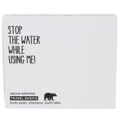 In den Produkten wird auf den Einsatz von Wasser verzichtet. Das spart Gewicht und verringert das Packmaß erheblich. Die kleinen Seifenstücke pflegen und reinigen Haut und Haar und werden durch 12 fluoridfreie Zahnputztabletten ergänzt. Sie werden wie normale Zahnpasta eingesetzt und vor dem Putzen zerkaut und mit etwas Speichel vermengt. So entsteht (schaumlose) Zahnpasta, die deine Zähne schonend reinigt.