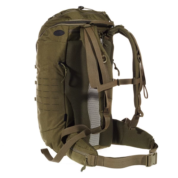Extrem robuster, modularer Rucksack aus Cordura–Nylon mit komplett zu öffnender Frontöffnung. An den Seiten ist der Rucksack mit MOLLE-Laschen in Laser-Cut-Ausführung versehen.